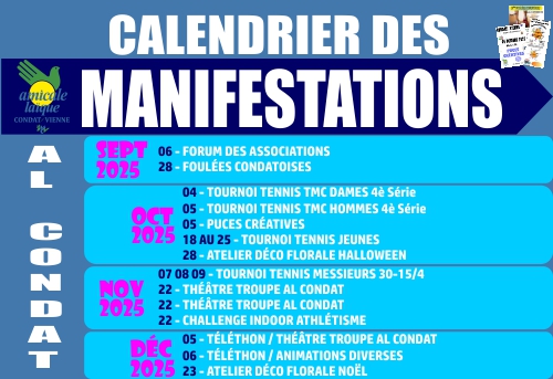 au public LUNDI Matin 10h00 – 12h30 Après-midi 14h00 – 18h00 MARDI Matin 10h00 – 12h30 Après-midi fermé au public MERCREDI Matin 10h00 – 12h00 Après-midi fermé au public JEUDI Matin fermé au public Après-midi 14h00 – 18h00 VENDREDI Matin 10h00 – 12h00 Après-midi 14h00 – 18h00 05.55.06.13.29 Amicale Laïque Condat sur Vienne Espace Bernard Caramigeas 21 rue Jules Ferry 87920 Condat sur Vienne 17/07/2025